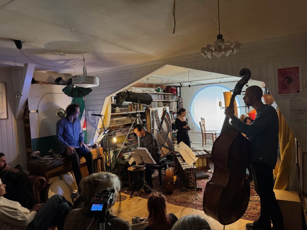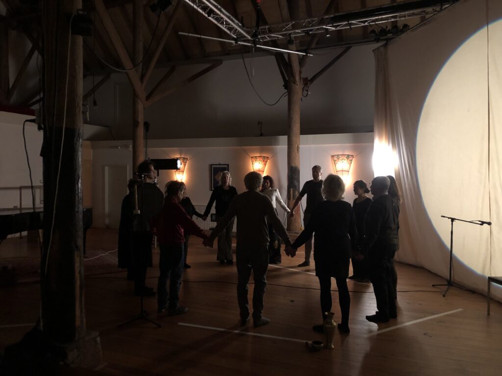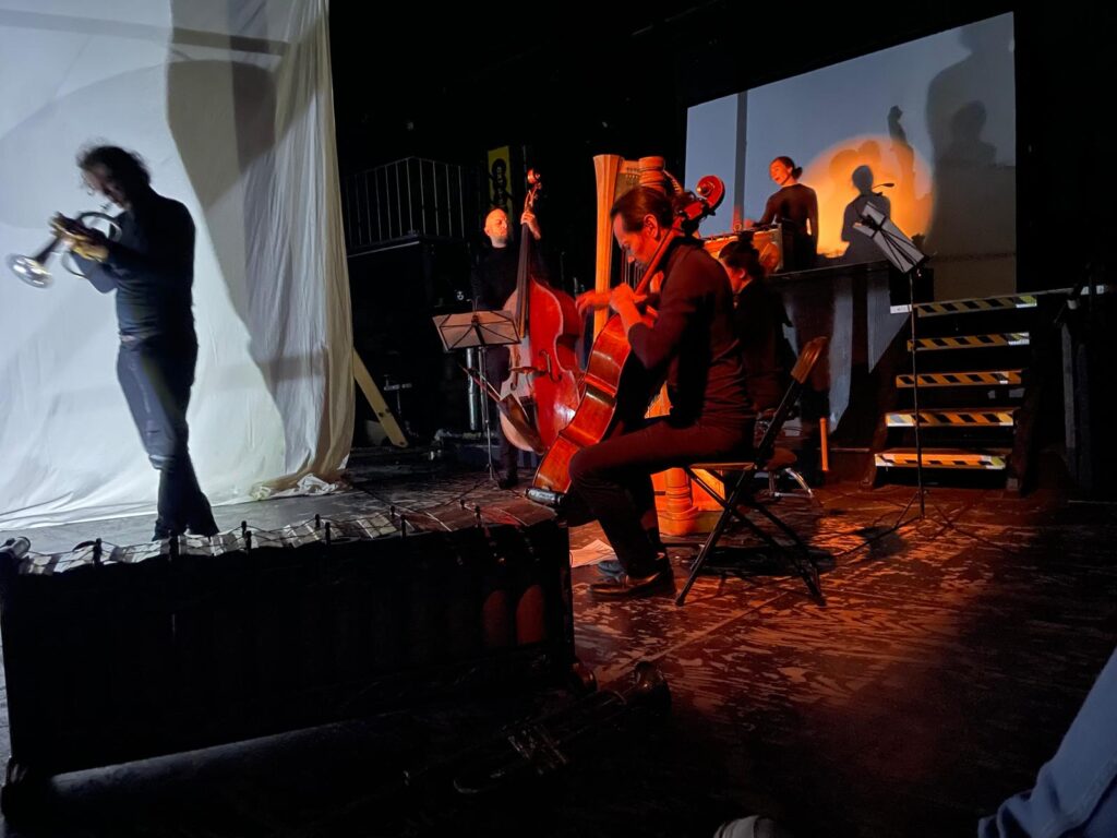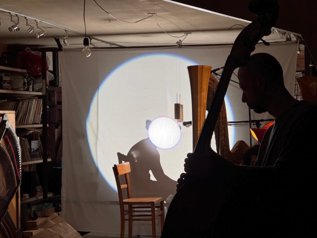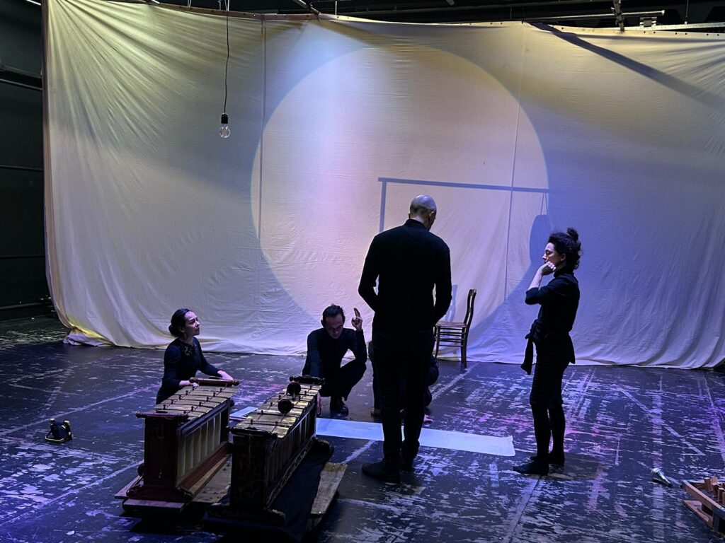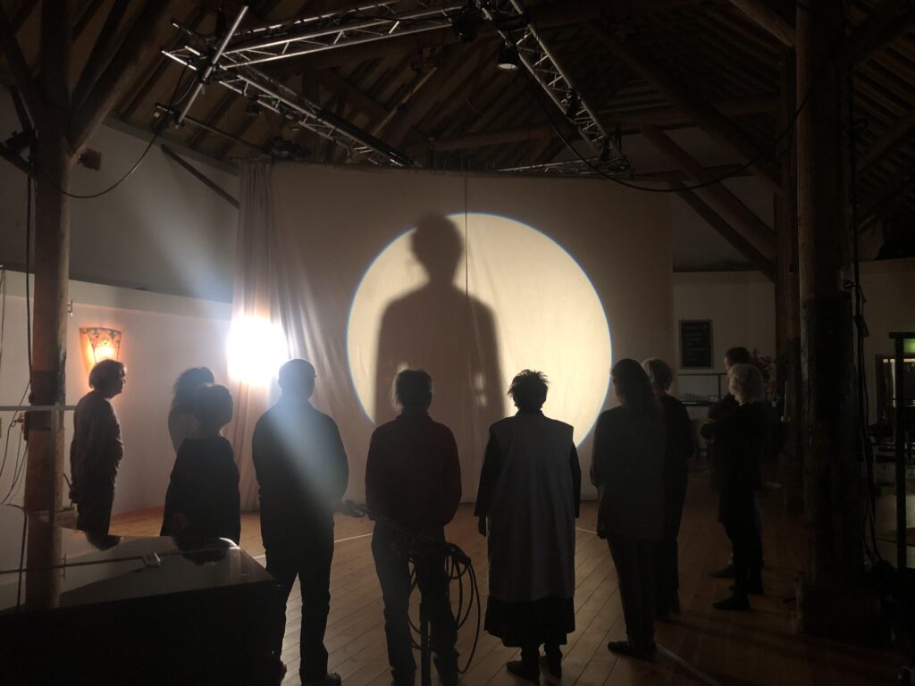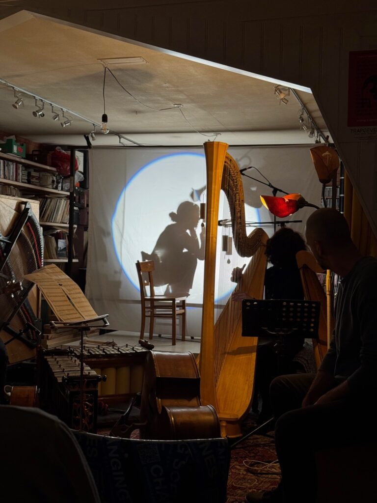 In de dagen tussen de muzikale repetities werkte Eef aan de composities en probeerden Nathalie en Eef samen het gevonden schaduwmateriaal van hun eerste samenwerking in het Dakota theater in het kleine trapgevelstudiootje te maken.. (op de foto Nathalie achter het doek en Eva en Stathis voor in het tegenlicht)