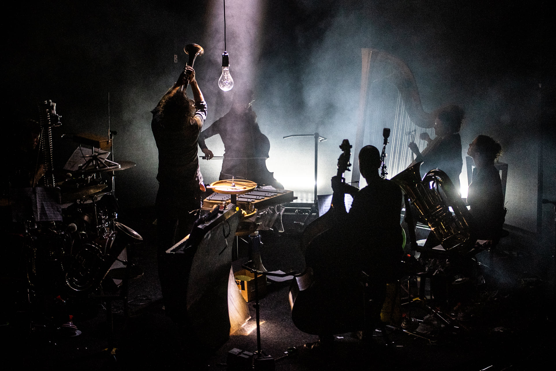 Stap in het schemerdonker waar woorden en klanken overal om je heen klinken, waar instrumenten het licht vangen en stemmen je meenemen op een buitengewone reis…