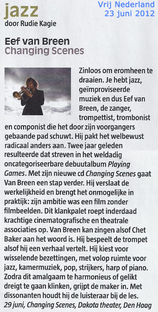 • ”Trumpeter and singer Eef van Breen came with Playing Games, which he wove his jazz with chamber music and theater sounds.” Amanda Kuyper Jazzism