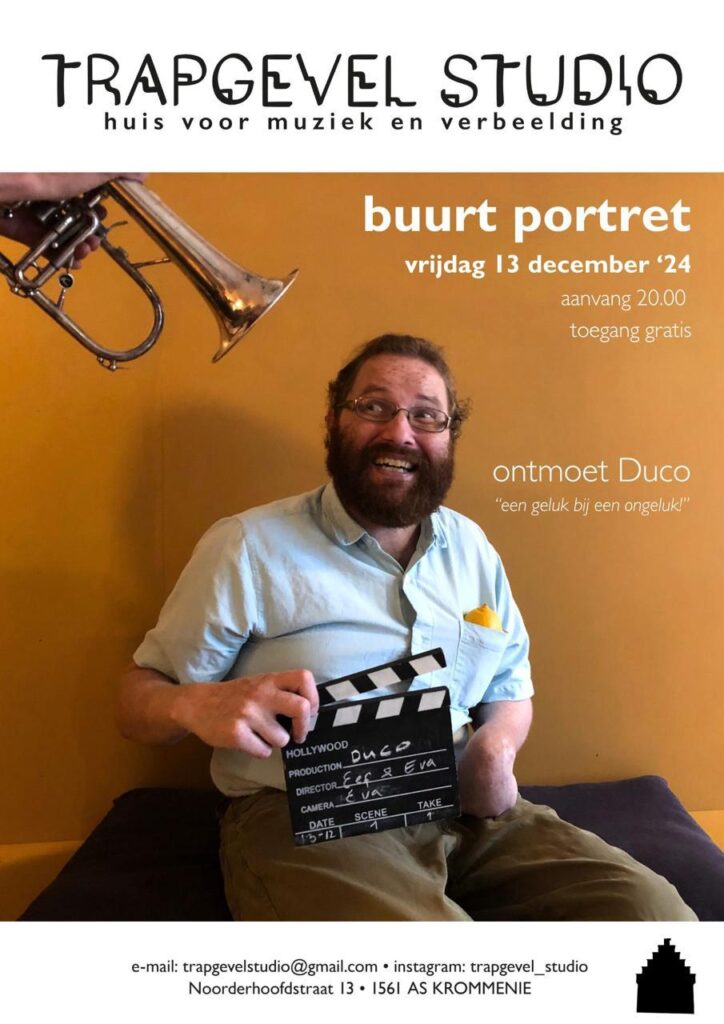 13 december 2024 Vrijdag de 13e lanceerden we met Duco het eerste Buurtportret in de trapgevelstudio. Een passende datum voor het programma met als titel “Een geluk bij een ongeluk” waarin Eef en Eva samen met Duco een voorstelling maakte op basis van zijn levensverhaal. Met Duco’s eigen gedichten als dramaturgische lijn maakten ze een poëtische vertelling over Duco’s tragische ongeluk dat zijn leven drastisch veranderde..