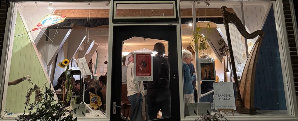 ==> Gastvrouwe en heer Eva en Eef leiden je graag rond in hun wonderlijke Zaanse pand uit 1910 dat bol staat van allerlei muziekinstrumenten, theaterdecor, kunstboeken en kunstobjecten. Zoals de panden van de plaatselijke slager, bakker en bloemist duidelijke functies hebben, beoogt de Trapgevel Studio vanuit een winkelpand midden in het historisch centrum van Krommenie een plek te zijn waar je je oor te luisteren kan leggen tijdens een concert, repetitie of muziekles om reflectie, inspiratie en fantasie ‘te halen’.